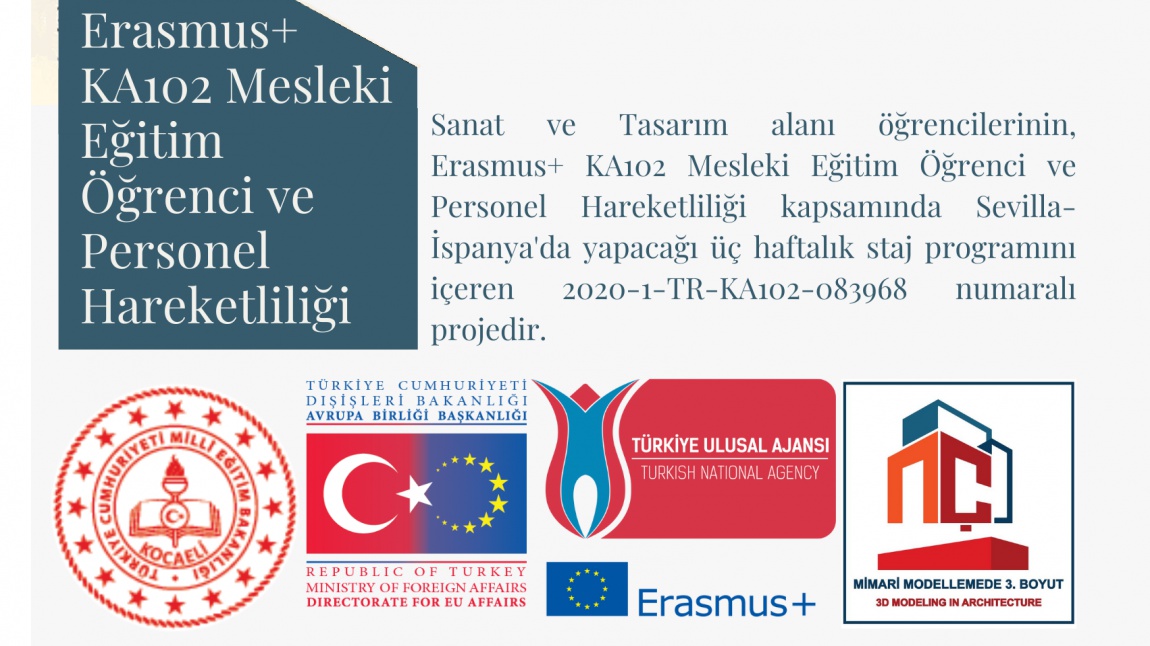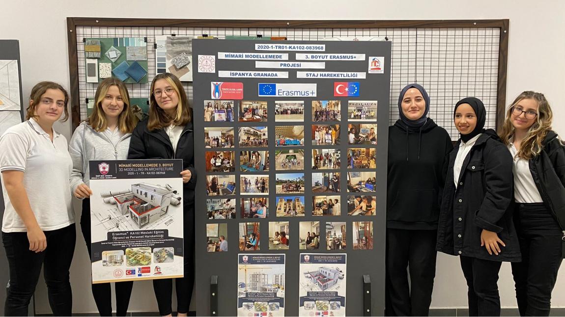 Okulumuz adına 2020 başvuru döneminde Sanat ve Tasarım alanının hazırlayıp sunduğu "MİMARİ MODELLEMEDE 3. BOYUT" isimli Erasmus+ KA102 Mesleki Eğitim Öğrenci ve Personel Hareketliliği projemiz Türkiye Ulusal Ajansı tarafından kabul edilmiştir. Okulumuz öğrencileri 2020-2021 eğitim öğretim yılında proje kapsamında İSPANYA-Granada'ya hareketlilik sağlayacaklar. İspanya'da öğrencilerimiz üç hafta süre ile staj yapacaklar.